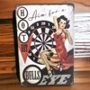 This is a rustic - looking, metal, silkscreen sign that has folded edges.